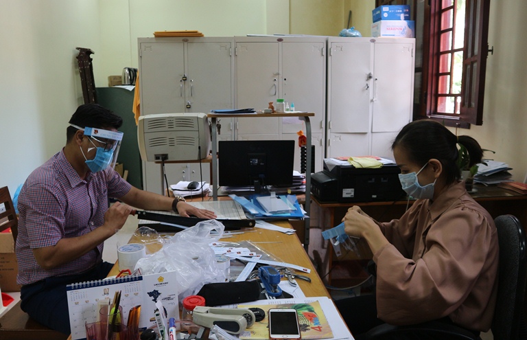 Để đảm bảo giản cách theo quy định của UBND tỉnh, của Văn phòng UBND tỉnh về thực hiện các biện pháp cấp bách phòng, chống dịch bệnh Covid-19, Chi đoàn đã phân ra các nhóm theo các công đoạn khác nhau: cắt miếng xốp; dán khẩu hiệu, sắp xếp thành phẩm…. Mỗi chiếc mũ chống giọt bắn đều có khẩu hiệu “Chi đoàn thành niên Văn phòng HĐND và UBND tỉnh chung tay phòng, chống dịch Covid-19”.