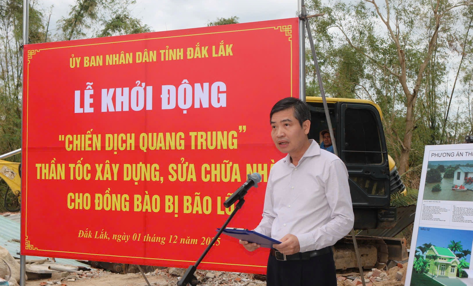 Phát biểu tại lễ khởi động, Chủ tịch UBND tỉnh Tạ Anh Tuấn nhấn mạnh: Thực hiện chỉ đạo của Bộ Chính trị, Ban Bí thư, Chính phủ và Thủ tướng Chính phủ về “Chiến dịch Quang Trung” chiến dịch thần tốc xây dựng, sửa chữa nhà ở cho các hộ dân miền Trung bị thiệt hại, UBND tỉnh Đắk Lắk chính thức phát động kế hoạch huy động tổng lực, tập trung xây mới và sửa chữa nhà ở cho người dân trong tỉnh. Tỉnh đặt mục tiêu hoàn thành sửa chữa toàn bộ nhà hư hỏng nặng trước ngày 31/12/2025; hoàn thành xây dựng lại nhà mới và bố trí tái định cư cho các hộ có nhà bị đổ, sập, nước cuốn trôi trước ngày 31/01/2026. Đây không chỉ là tiến độ mang tính mốc thời gian, mà còn là cam kết của tỉnh trong việc bảo đảm mọi người dân sớm ổn định nơi ở, đón Tết Nguyên đán và năm mới 2026 trong điều kiện an toàn và ấm cúng.