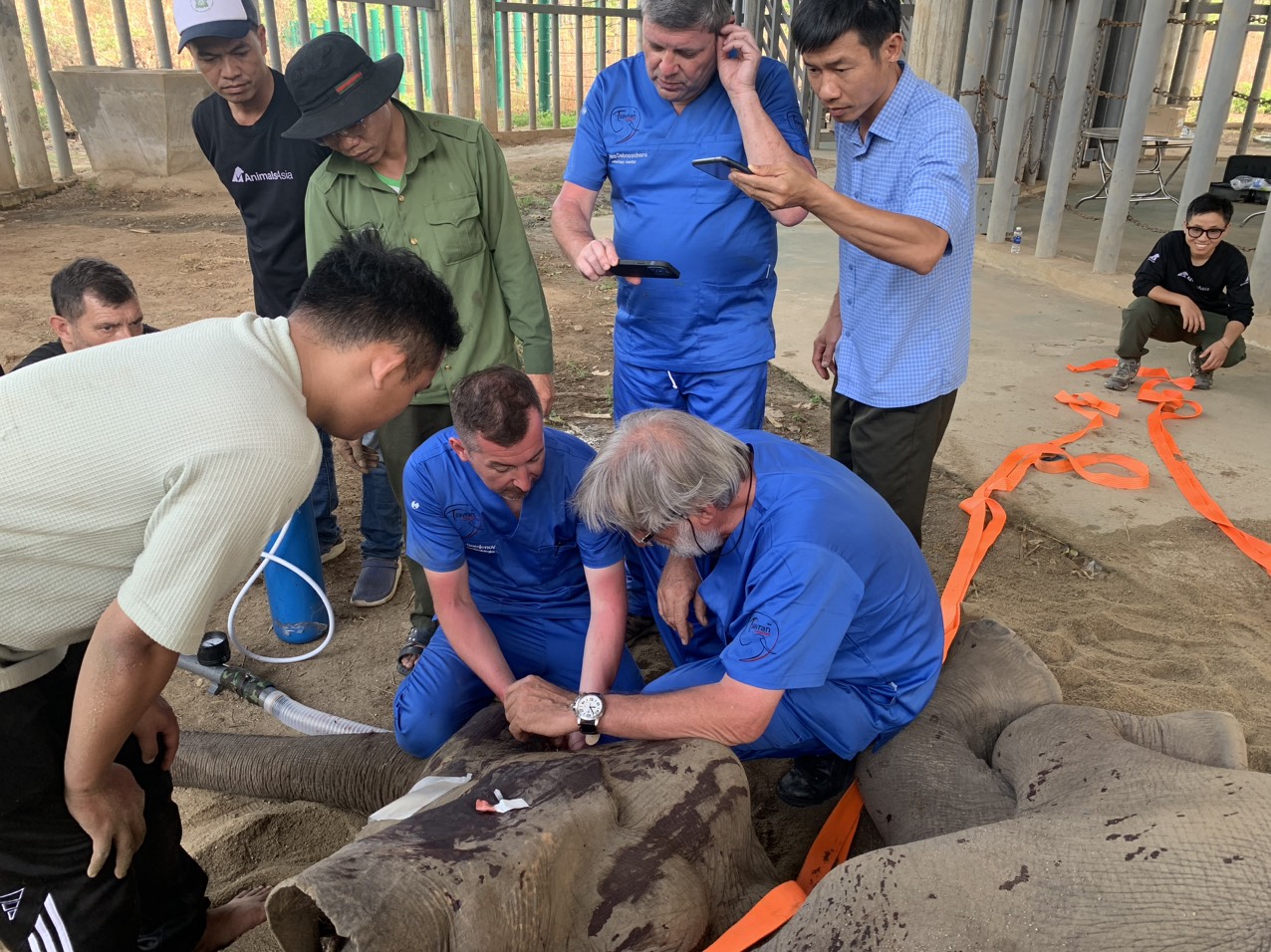 Các bác sĩ chăm sóc sức khỏe cho voi trong dự án do tổ chức AAF tài trợ.