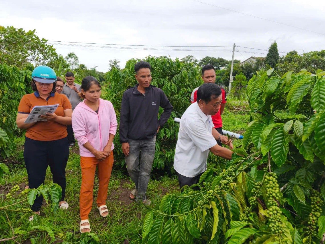 Hướng dẫn người dân kỹ thuật canh tác cà phê trong dự án do tổ chức SNV (Hà Lan) tài trợ.
