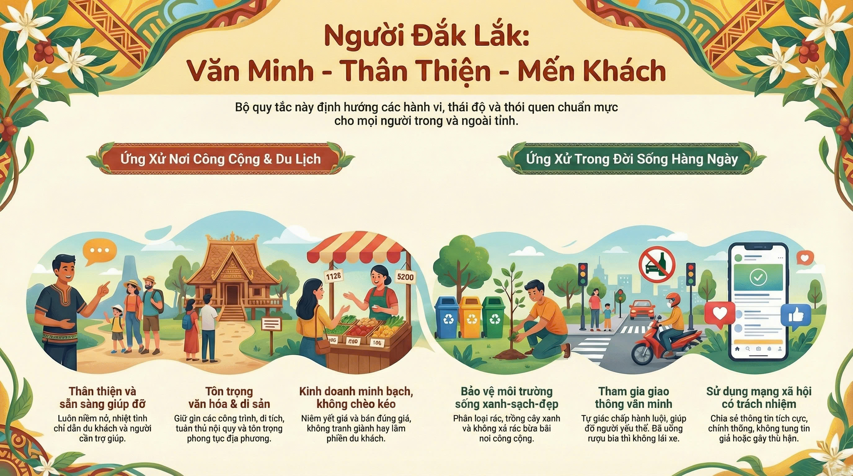 Quyết định số 02330/QĐ-UBND của UBND tỉnh Đắk Lắk ban hành “Bộ quy tắc ứng xử Người Đắk Lắk Văn minh - Thân thiện - Mến khách”. Nội dung của “Bộ quy tắc ứng xử gồm: