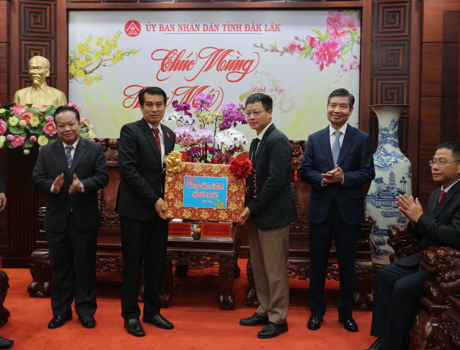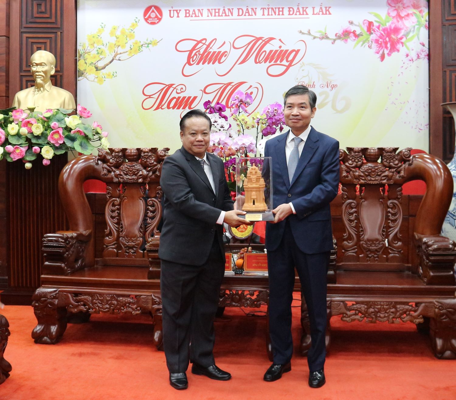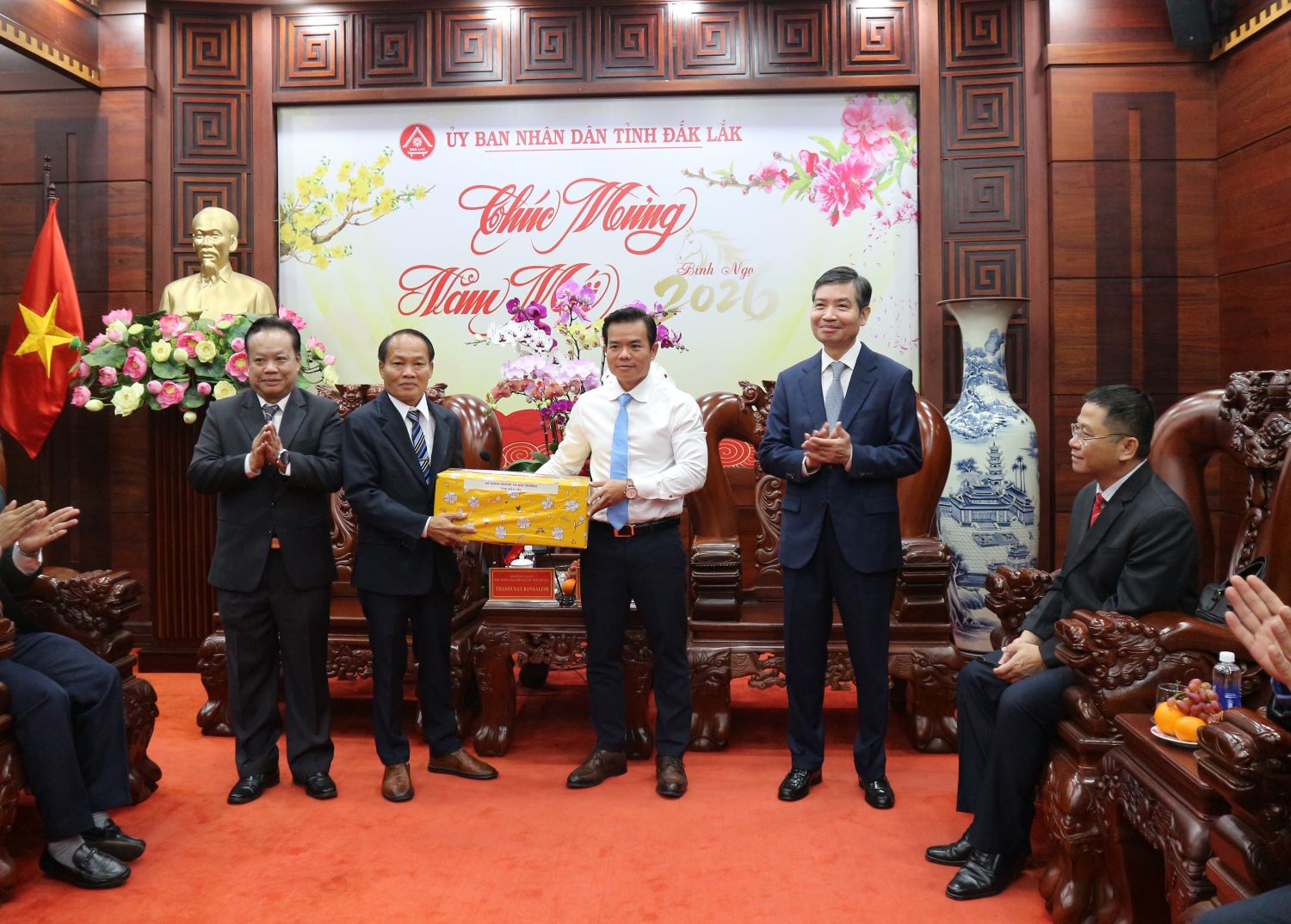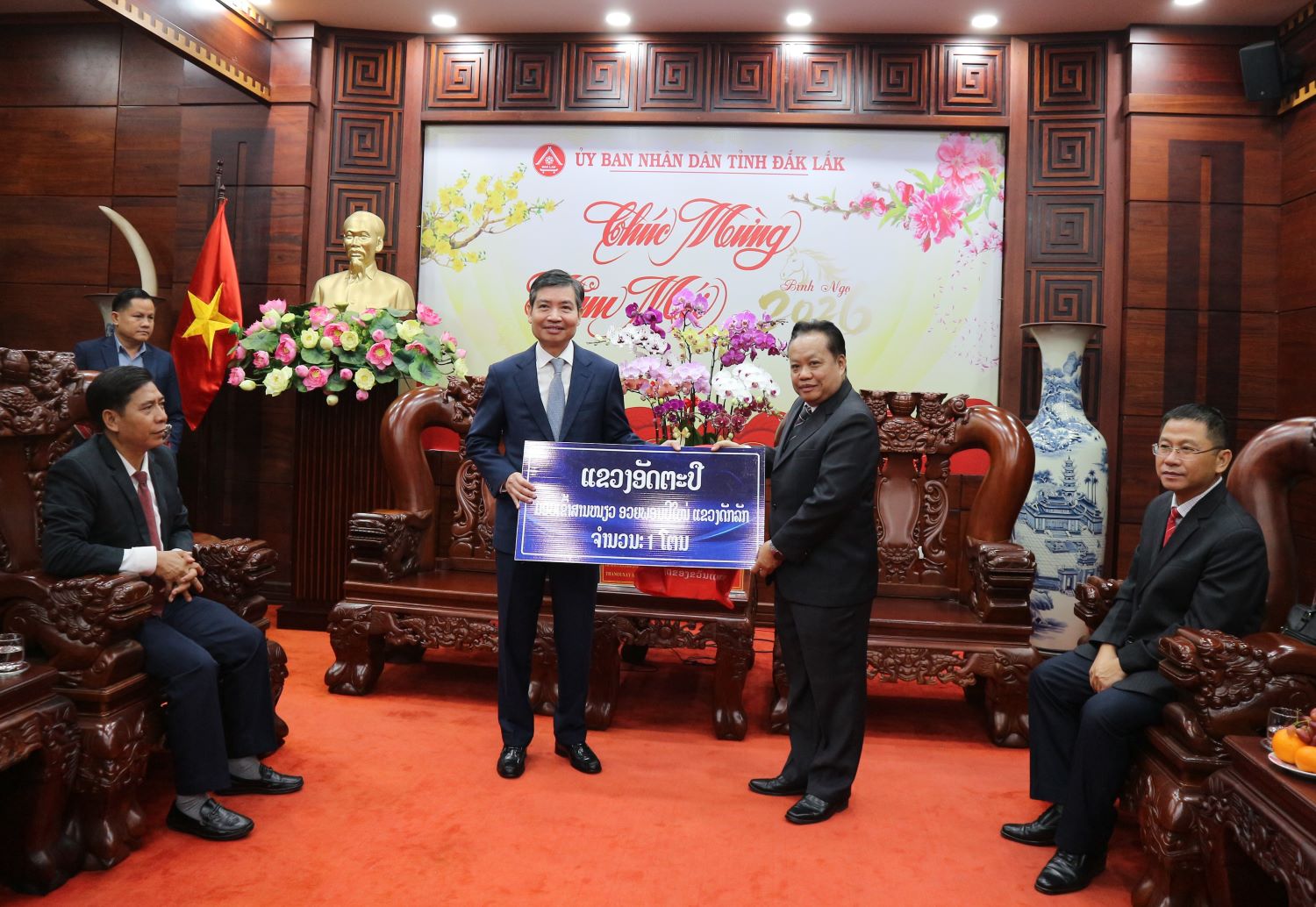 Đồng chí Thạ Nu Xay - Băn Sa Lít - Phó Bí thư Tỉnh ủy, Chủ tịch Ủy ban Chính quyền tỉnh Attapeu tặng hoa tỉnh Đắk Lắk chúc mừng năm mới 2026