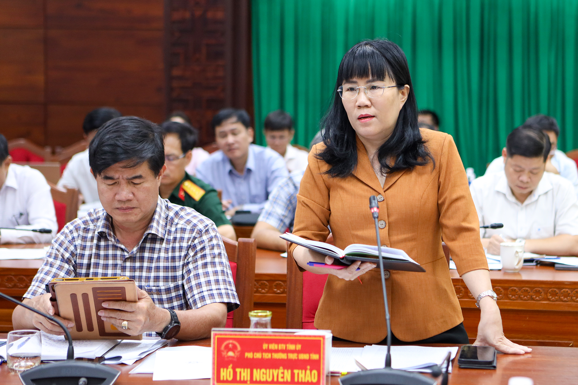 Đồng chí Hồ Thị Nguyên Thảo - Ủy viên Ban Thường vụ Tỉnh ủy, Phó Chủ tịch Thường trực UBND tỉnh phát biểu tại cuộc họp.