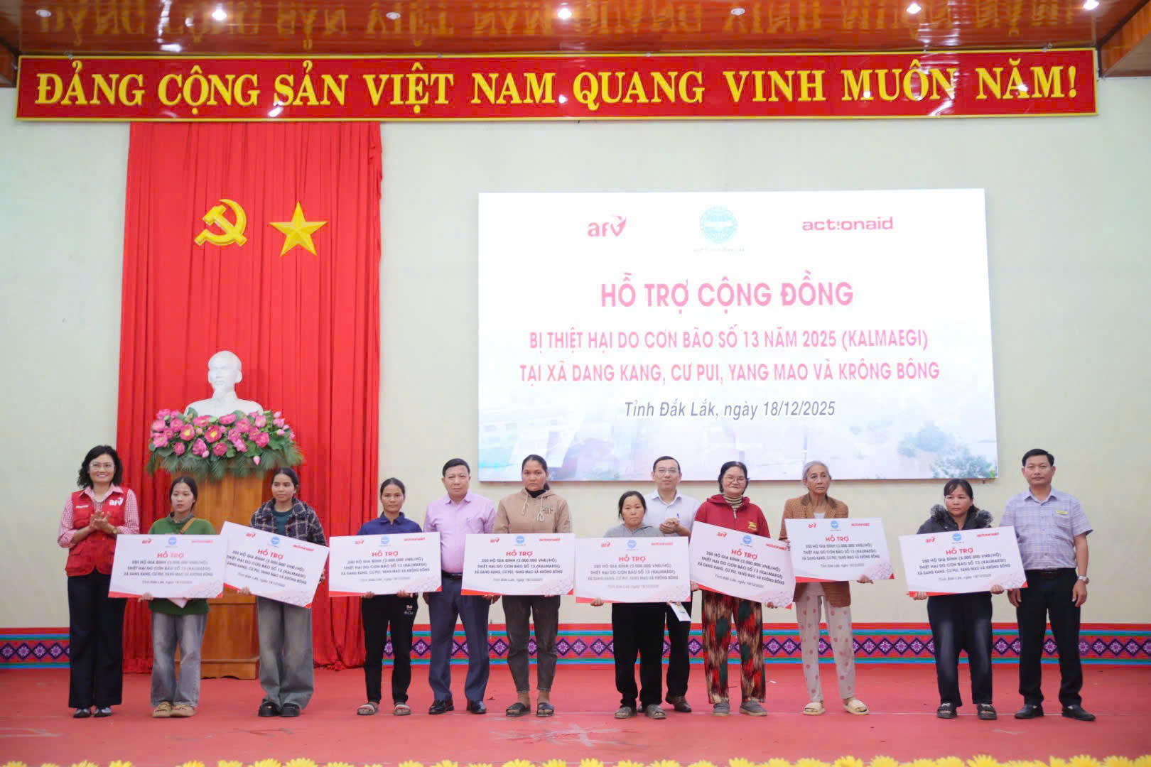 Chiều ngày 18/12/2025, Tổ chức ActionAid quốc tế tại Việt Nam phối hợp với Quỹ hỗ trợ chương trình, dự án an sinh xã hội Việt Nam (AFV) và Liên hiệp các tổ chức hữu nghị tỉnh Đắk Lắk tổ chức cấp phát tiền mặt hỗ trợ hơn 350 hộ nghèo và cận nghèo bị thiệt hại nặng nề do lũ lụt gây ra trên địa bàn tỉnh Đắk Lắk tại các xã Dang Kang, Cư Pui, Krông Bông và Yang Mao với tổng kinh phí 1,05 tỷ đồng.