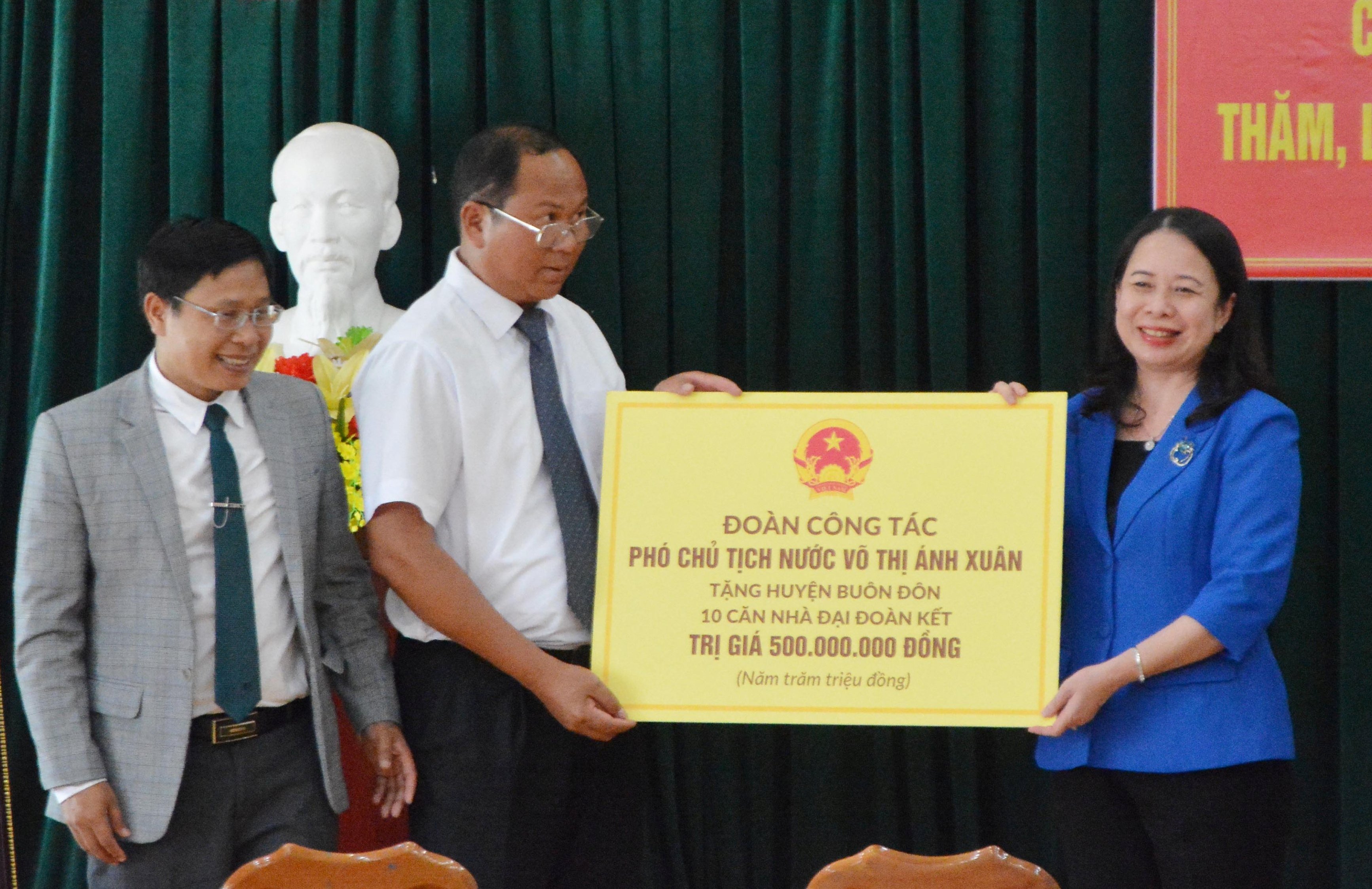Nhân dịp này, Phó Chủ tịch nước Võ Thị Ánh Xuân đã trao tặng 10 ngôi nhà Đại đoàn kết cho người dân có hoàn cảnh khó khăn; tặng 50 suất quà cho các hộ nghèo; 200 suất quà cho trẻ em có hoàn cảnh đặc biệt khó khăn trên địa bàn huyện Buôn Đôn.