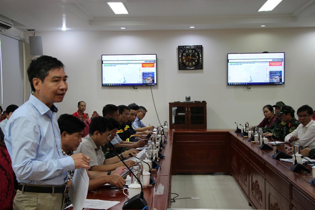 Đồng chí Chủ tịch UBND tỉnh Tạ Anh Tuấn báo cáo công tác ứng phó mưa lũ trên địa bàn tỉnh.