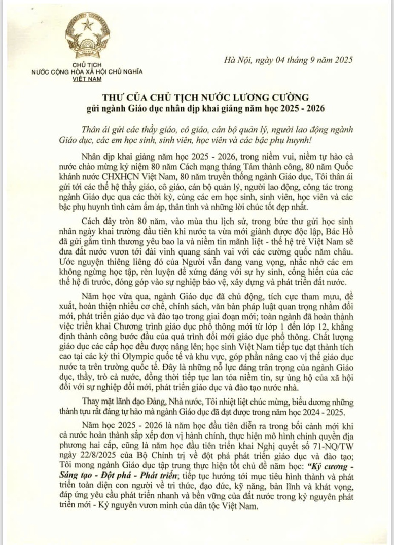Thư của Chủ tịch nước Lương Cường gửi ngành Giáo dục nhân dịp khai giảng năm học 2025-2026