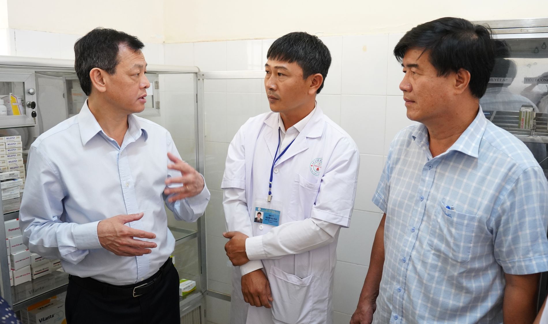 Thứ trưởng Bộ Y tế Nguyễn Tri Thức và Phó Chủ tịch UBND tỉnh Nguyễn Thiên Văn kiểm tra thuốc, vật tư y tế phục vụ công tác khám chữa bệnh tại Trạm y tế xã Ea Phê.