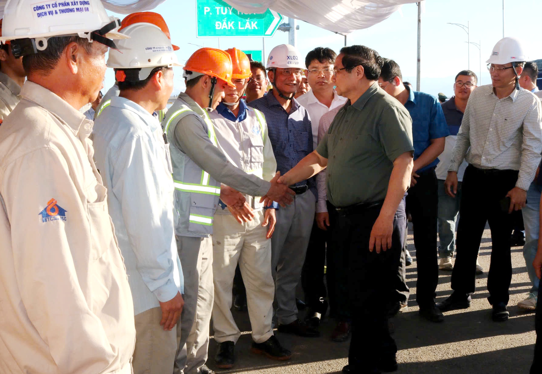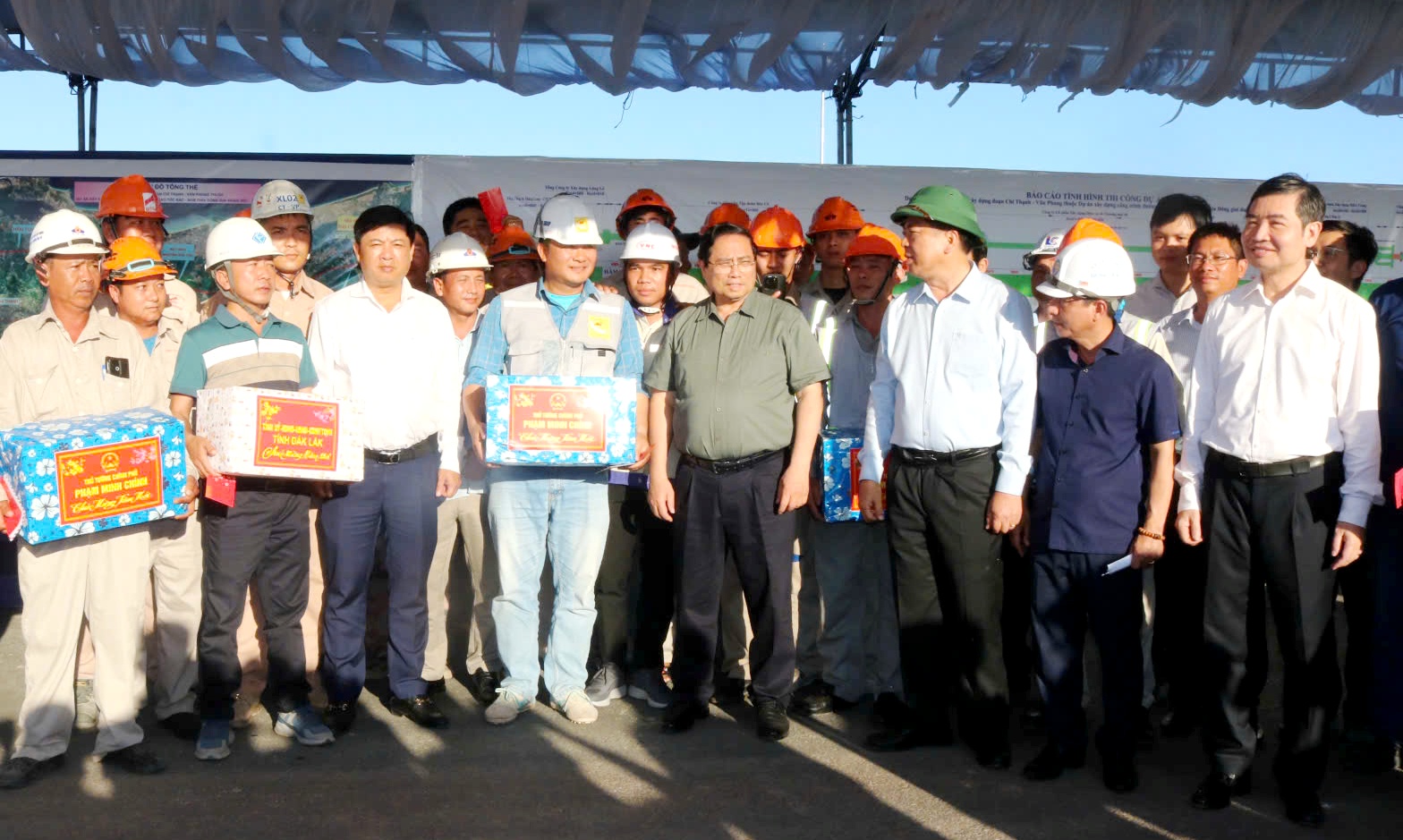 Tại công trường, Thủ tướng và đoàn công tác đã động viên, tặng quà Ban Quản lý dự án 7 cùng đội ngũ kỹ sư, công nhân đang thi công. Thường trực Tỉnh ủy Đắk Lắk cũng trao quà động viên lực lượng làm nhiệm vụ trên công trường.
