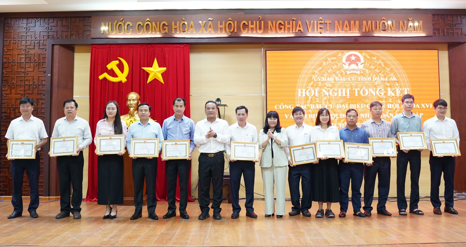Đồng chí Y Giang Gry Niê Knơng - Phó Bí thư Tỉnh ủy, Chủ tịch Ủy ban MTTQ Việt Nam tỉnh, Phó Trưởng Ban Chỉ đạo công tác bầu cử tỉnh, Phó Chủ tịch Ủy ban bầu cử tỉnh và đồng chí Hồ Thị Nguyên Thảo - Ủy viên Ban Thường vụ Tỉnh ủy, Phó Chủ tịch Thường trực UBND tỉnh trao tặng Bằng khen cho các cá nhân.