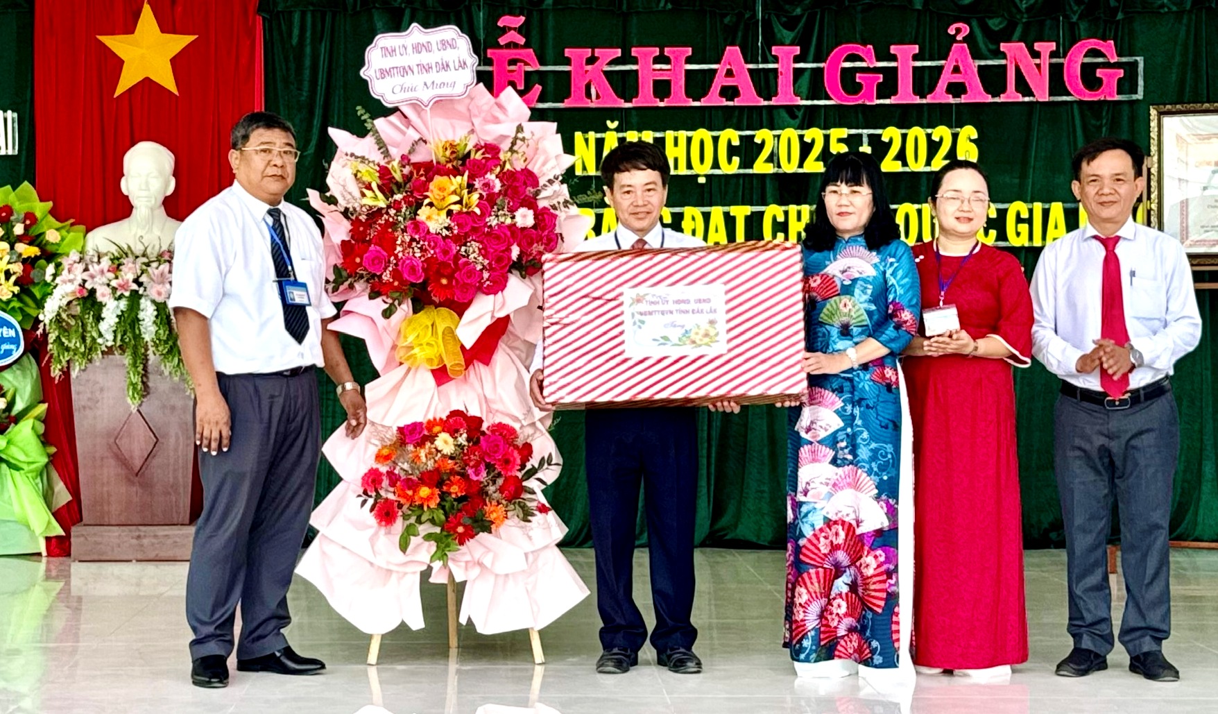 Phó Chủ tịch Thường trực UBND tỉnh Hồ Thị Nguyên Thảo và lãnh đạo Sở Giáo dục và Đào tạo tặng hoa và quà chúc mừng nhà trường nhân dịp khai giảng năm học mới.