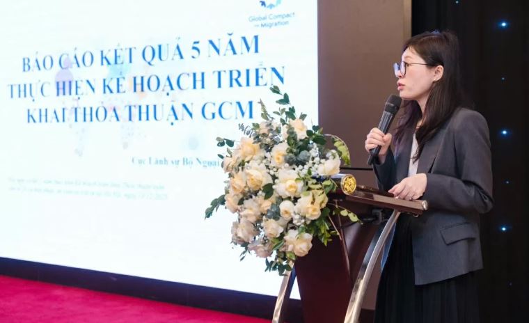 Phó Cục trưởng Cục Lãnh sự Phan Thị Minh Giang trình bày Báo cáo kết quả 5 năm triển khai Thỏa thuận GCM.